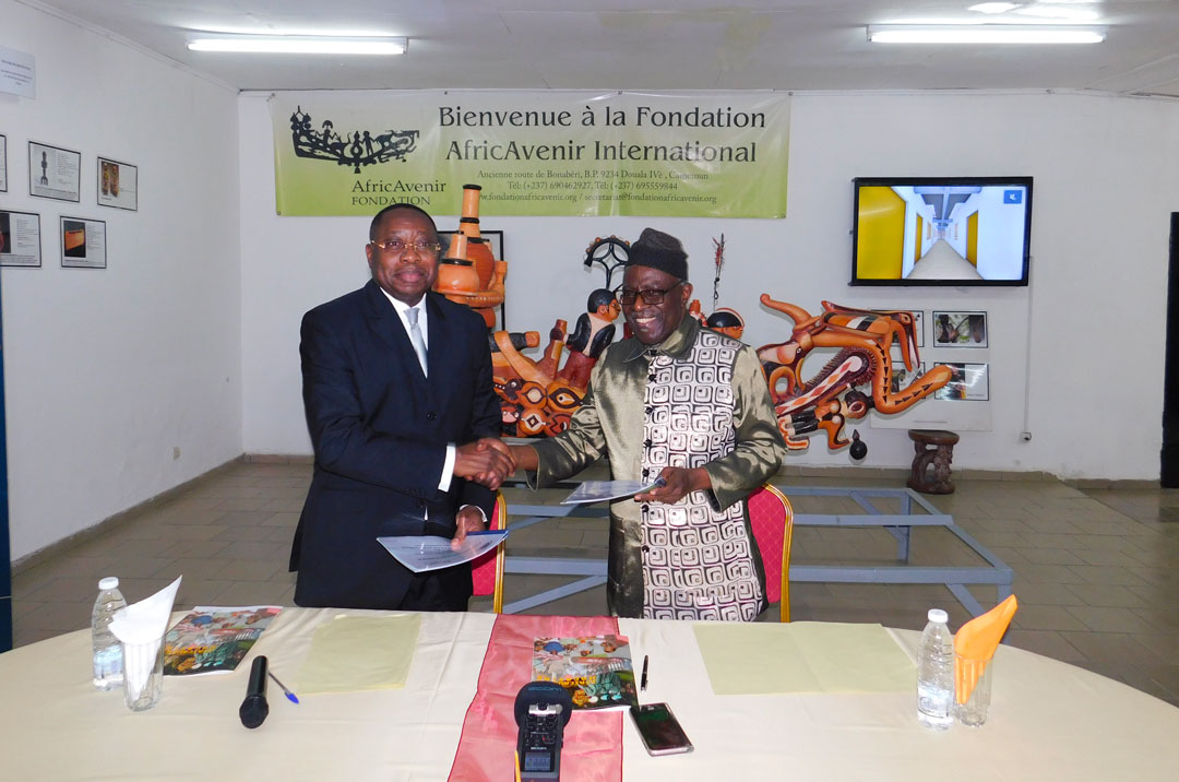 Auguste MBAPPE PENDA, Directeur Général du CNCC, Maître d’œuvre du Musée Maritime de Douala et Prince KUM’A NDUMBE III PDG de la Fondation AfricAvenir International ont procédé à la signature d’un protocole de Convention le 10 décembre 2019 à Douala Bonaberi.